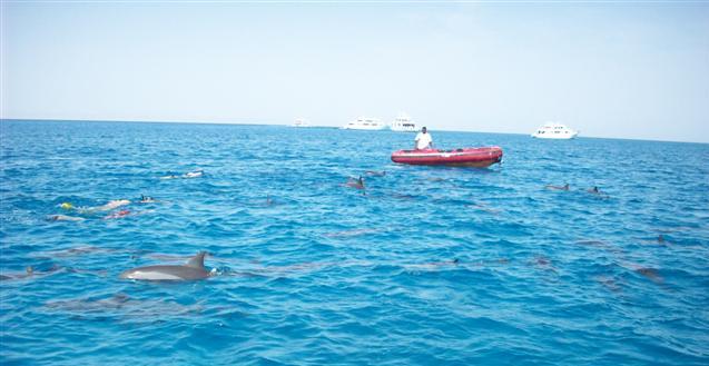 Dopo aver lasciato il comodo ridosso dell’isola di Sirnaka, dove ci siamo fermati per il pranzo, dirigiamo verso Nord e dopo un paio di ore raggiungiamo la vasta laguna di Dolphin Reef, in vista della lunga penisola di Ras Banas. Questa laguna è protetta da un grandissimo reef ampio circa 6 km a forma di ferro di cavallo e al suo interno vivono intere famiglie di stenelle. Arrivati nella laguna rimaniamo incantati dal colore dell’acqua blu/turchese. Un colore incredibile, esaltato dai raggi del sole e dalla splendida sabbia bianca che ricopre il basso fondale all'interno della laguna: un sogno! Questa è davvero “Laguna Blu”, penso. Appena ancorata la “Princess Zeinab” vediamo spuntare a poca distanza le sagome scure di un bel gruppo di delfini che tagliano la sottile linea che divide il mare dal cielo con il loro tipico elegante movimento dentro e fuori dall’acqua. Sono Stenelle longirostris (stenelle dal lungo rostro), la cui caratteristica più evidente è il rostro lungo e sottile che li distingue dalle altre specie. Sono dei piccoli delfini che al massimo raggiungono i due metri di lunghezza, dalla colorazione grigio scura con il ventre più chiaro intervallato da striature orizzontali scure. Si tratta di animali molto diffusi in tutta la fascia tropicale, ma purtroppo sono in pericolo di estinzione. Subito saltiamo sui due gommoni e dopo due minuti di navigazione facciamo un tuffo all’indietro e ci troviamo nel blu! I delfini sono ad appena una decina di metri da noi. Ce ne sono parecchi, si sentono fischiare in tutte le direzioni. Nuotiamo verso di loro e li fotografiamo da molto vicino, oltre che da bordo dei gommoni. Siamo tutti riuniti più o meno in una zona circolare del diametro di un centinaio di metri. Ogni tanto risaliamo su un gommone che ci recupera al volo e poi si sposta velocemente nella laguna per raggiungere il branco che nel frattempo ha cambiato direzione. Una breve corsa e poi giù di nuovo nell’acqua. Su è giù per un’ora, con estrema fatica ma sorretti dall’entusiasmo. Un vero spettacolo il bagno in mezzo ai delfini!! Torniamo felici e appagati sulla nostra barca, poi, alle 20 scendiamo di nuovo in acqua per la notturna, rimanendo immersi in prossimità della “Princess Zeinab”. La sabbia bianca sotto alla barca è costellata da piccoli pinnacoli rocciosi coperti di corallo duro e di alcionari. Nuotiamo rimanendo sui 15 metri di profondità per circa un’ora, sino a quando ce lo consente l’autonomia delle nostre torce e osserviamo decine di pesci scorpione che approfittando delle nostre luci cacciano piccoli pesci. L'ambiente è estremamente ricco di gamberetti, paguri e ricci. Ci sono anfratti che, illuminati dal fascio della torcia, si accendono con tanti puntini luccicanti: sono gli occhi dei gamberetti che, accecati, si ritirano nuotando all'indietro. Vediamo dei carangidi semiaddormentati che dondolano nell’acqua, una grossa murena grigia lunga un metro e mezzo che nuota in acqua libera e che alla nostra vista fugge a rintanarsi impaurita, vediamo anche un polpo dall’incredibile colorazione turchese, un grosso pesce scatola, dei bellissimi crinoidi rossi e bruni e delicati idrozoi dai riflessi luminescenti. E’ proprio vero: la notte è uno spettacolo! |