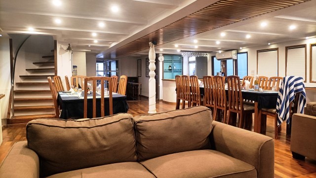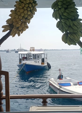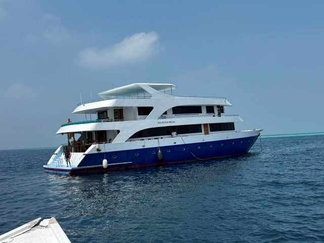Ed ecco il racconto del viaggio.Partito da Roma Fiumicino con un aereo della Gulf Air (la compagnia di bandiera del Bahrein), dopo aver fatto scalo nel grandissimo aeroporto di Manama, sono arrivato a Malè, dove sono sbarcato nel nuovissimo aeroporto internazionale Velana, sull’isola di Hulhulé.I miei compagni di viaggio sono arrivati con diversi aerei provenienti da varie destinazioni e a poco a poco si è formato il nostro gruppo. Stanchi e accaldati per il lungo viaggio e per il cambio di fuso orario (4 ore di differenza), abbiamo atteso a lungo sul molo davanti all’aeroporto che venisse a prenderci il dhoni che doveva portarci alla nostra barca. Poi, finalmente, è arrivato il dhoni che ha portato noi e i nostri bagagli fino alla nostra barca che era alla fonda nel porto. La barca era la “Maldivian Dream”, un’imbarcazione lunga 30 metri e larga 11 piuttosto vecchiotta (anno di costruzione 2005), ma ristrutturata nel 2011. In ogni caso la barca si è dimostrata piuttosto comoda e dotata di tutti i servizi necessari, compresa una bella vasca da idromassaggio sul ponte superiore dotato di lettini prendisole. Il comandante e l’equipaggio si sono dimostrati sempre molto efficienti e ci hanno fatto sentire a nostro agio.