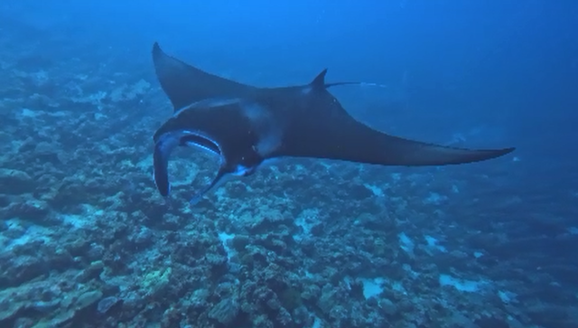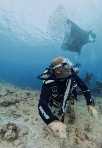 Venerdì 20 febbraio ore 7:15 – RANGALI MADIVENU (Ari South Atoll) ci immergiamo su una secca poco distante dall’isola di Rangali e nuotiamo per circa un’ora sopra il cappello, nella vana ricerca del mitico squalo balena… che ovviamente non si fa vedere. La sommità della secca è piuttosto spoglia: è ricoperta di coralli tavola, ma priva di colori. L’immersione è abbastanza noiosa, fino a quando non appaiono un paio di squali grigi e poi, per fortuna due grosse mante che volteggiano eleganti sopra le nostre teste. La visibilità è piuttosto scarsa a causa della grande presenza di plancton. Vediamo un pesce Napoleone, una murena nera, e una bella nuvola gialla di pesci azzannatori striati. Ci sono anche rossi pesci soldato, pesci farfalla bandiera, pesci chirurgo, pesci ago… tanti pescetti di barriera, ma tutto sommato noiosa. Decido già di saltare la prossima immersione perché è molto simile a questa.