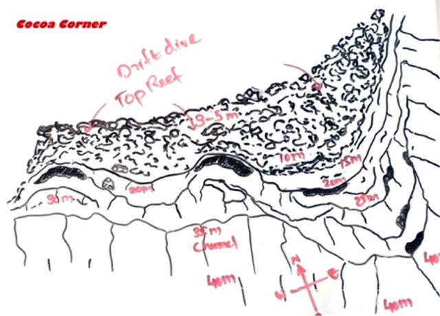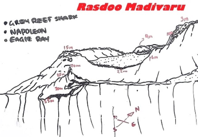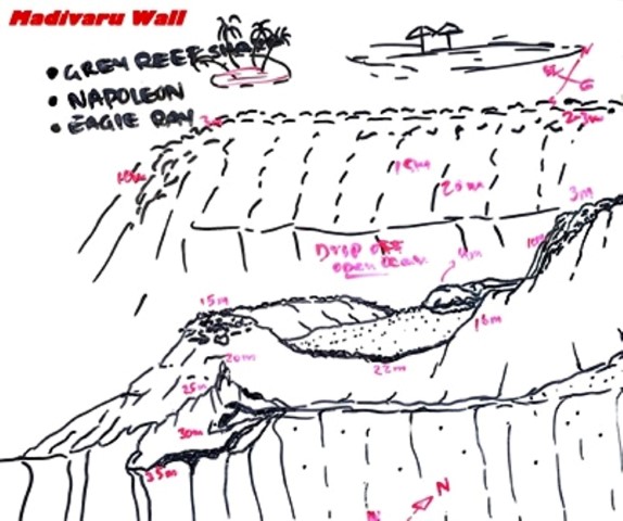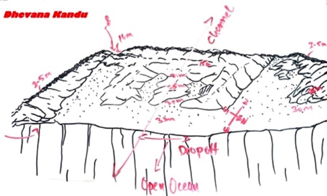 Ore 14:30 – DEVANA KANDU (Vaavu Atoll) dopo aver navigato verso est raggiungiamo il piccolo atollo di Vaavu e c’immergiamo sul lato orientale dell’atollo. Devana Kandu è un'area marina protetta, nota per le sue immersioni in corrente, la ricca vita pelagica e i paesaggi corallini spettacolari. Questo canale (kandu) offre uno scenario fatto di sporgenze e piccole grotte, ricco di squali grigi, squali pinna bianca, aquile di mare, banchi di fucilieri e coralli molli colorati. Ci tuffiamo giù a capofitto controcorrente fino a raggiungere il bordo del drop off a 35 metri di profondità e ci aggrappiamo alle rocce per riprendere fiato e osservare il “teatro pelagico” d’azione: un folto gruppo di squali grigi che nuotano avanti e indietro davanti a noi. Staccatici dal fondo dopo una ventina di minuti, iniziamo la drift dive, facendoci trascinare dalla corrente vorticosa. Le condizioni ambientali solo le migliori perché l’alta marea genera una corrente entrante che dall’oceano porta acqua limpida all’interno della barriera attivando la catena alimentare e garantendo la presenza di grandi pesci. Voliamo letteralmente sopra il fondo sabbioso della pass rimanendo a 25 metri, mentre tutto scorre velocemente attorno a noi come in un film. Non c’è molto tempo per osservare il pesce, perché la corrente fortissima ci trascina via; comunque riesco a vedere almeno una bella murena leopardo (bianca con macchie nere e gialle) che spunta fuori dalla sua tana. L’immersione è molto breve perché la fatica dovuta alla corrente ci fa consumare moltissimo gas. Peccato.