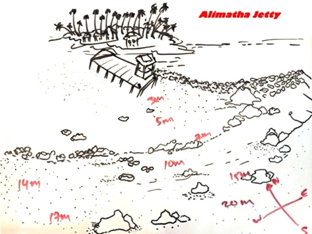 Ore 19:00 – ALIMATHA JETTY (Vaavu Atoll) questa è la classica immersione notturna in un sito molto famoso per l’abbondante presenza di grossi squali nutrice che stazionano nei pressi del pontile (jetty) della piccola isola di Alimatha. Scendiamo in acqua che e gia buio e iniziamo la ricerca degli squali, che però all’inizio non si fanno vedere. La cosa insolita in questo puto d’immersione è che questa volta c’è una forte corrente che ci costringe a rimanere aggrappati alle rare rocce che spuntano dal fondo sabbioso. Rimaniamo per un po’ di tempo in ginocchio sulla sabbia bianca con il naso all’insù in cerca degli squali, ma vediamo solamente un grosso pinna bianca e un nutrice. Ci spostiamo un po’ dall’altro lato del pontile e, finalmente, appaiono 5-6 squali nutrice che ci nuotano accanto per una mezzoretta e approfittano della luce prodotta dalle nostre torce per fare una scorpacciata del plancton diffuso nell’acqua. Lo squalo pinna bianca si è spostato insieme a noi e continua a farci compagnia insieme a un gruppo di carangidi in caccia. Vediamo anche una grossa aragosta che ci stuzzica l’appetito ricordandoci che ormai è ora di cena, perciò dopo una cinquantina di minuti risaliamo sul nostro dhoni. |