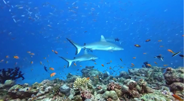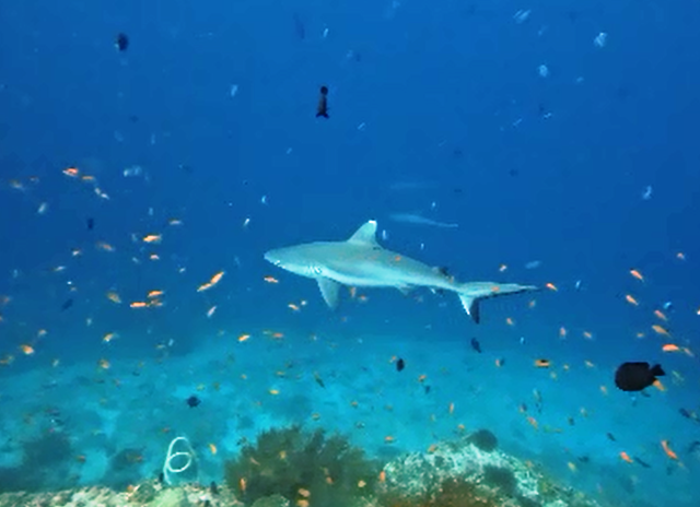 Giovedì 19 febbraio ore 7:30 – FISH HEAD (Ari North Atoll) questo è uno dei siti d’immersione più famosi delle Maldive, protetto dal governo e rinomato per l’abbondanza di vita marina, specialmente squali grigi di barriera, pesci Napoleone e formazioni coralline. Ci tuffiamo nel blu e nuotiamo contro corrente fino a raggiungere la thila circolare che ha pareti ripide, grotte e strapiombi che precipitano in profondità. Ci trasciniamo con le mani sulla roccia sino ad arrivare ad una balconata affacciata nel blu dalla quale possiamo osservare il passaggio degli squali grigi e dei pinna bianca. La corrente è molto forte e rimaniamo aggrappati per una cinquantina di minuti ad osservare una specie di acquario in movimento: davanti a noi oltre agli squali nuotano grossi carangidi, una bella aquila di mare, banchi di fucilieri e variopinti pesci farfalla. Il tempo trascorre in fretta e ci facciamo portare dalla corrente sul cappello della secca per poi risalire nel blu ed essere ripescati dal dhoni.